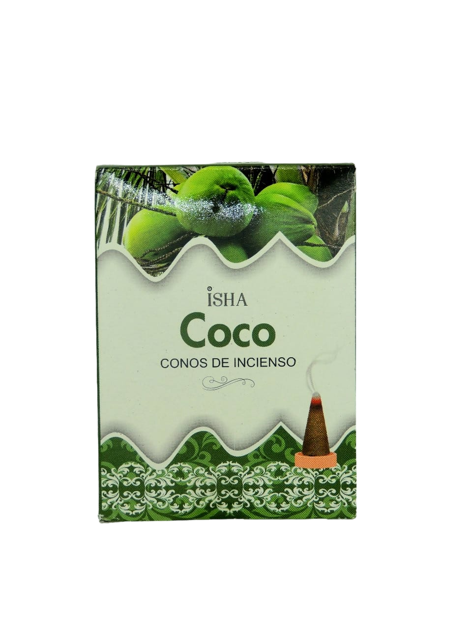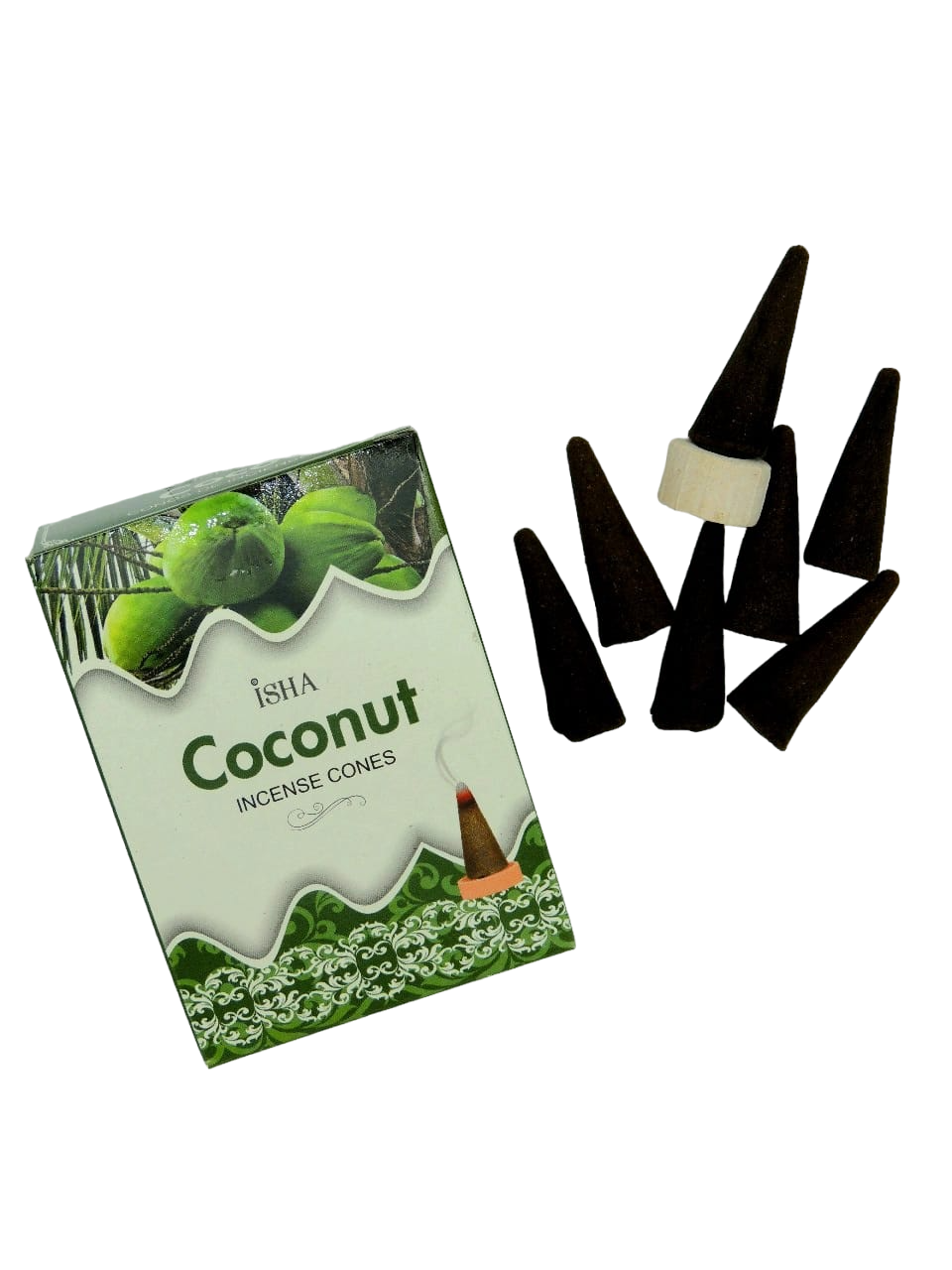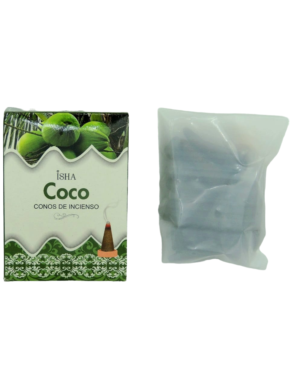 Incienso natural de aroma Coco, Caja que contiene 14 conos, elaborado en la India.