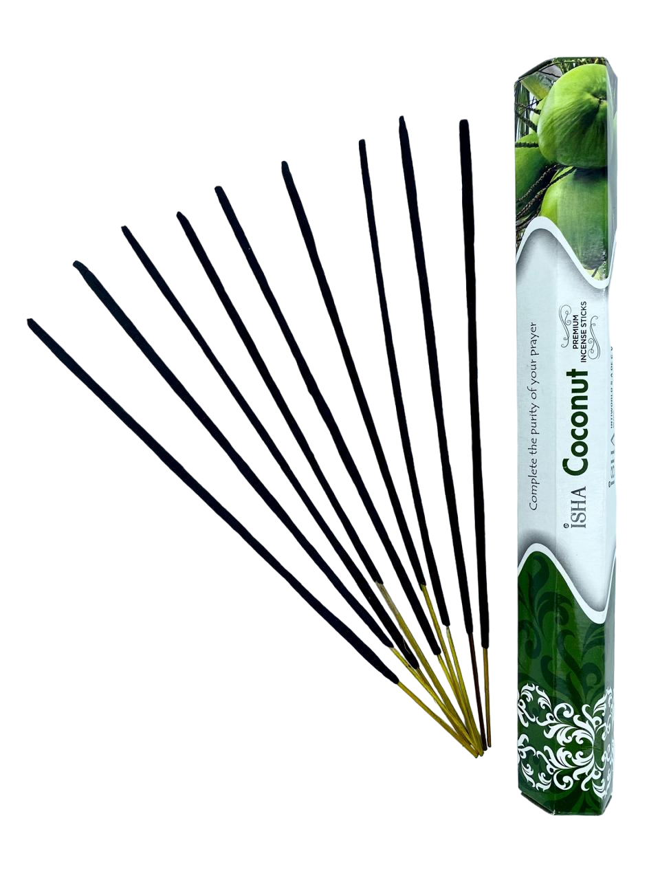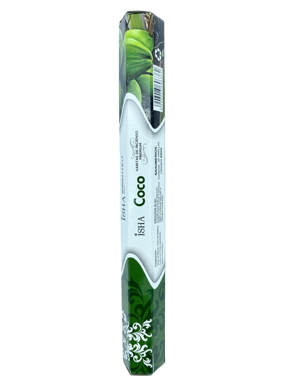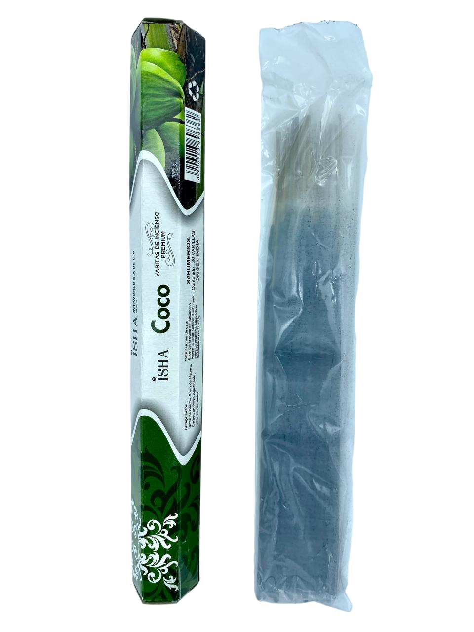 Incienso natural de aroma Coco, sobre que contiene 20 varitas, elaborado en la India.