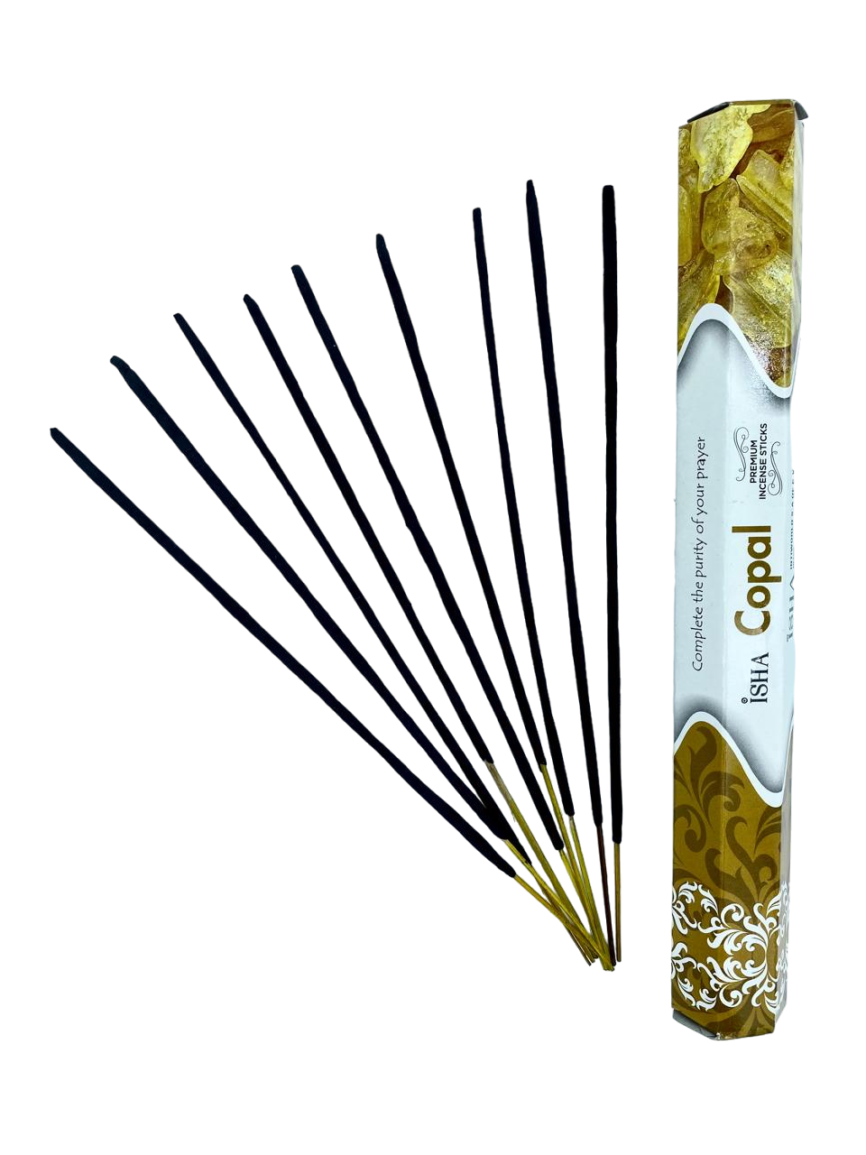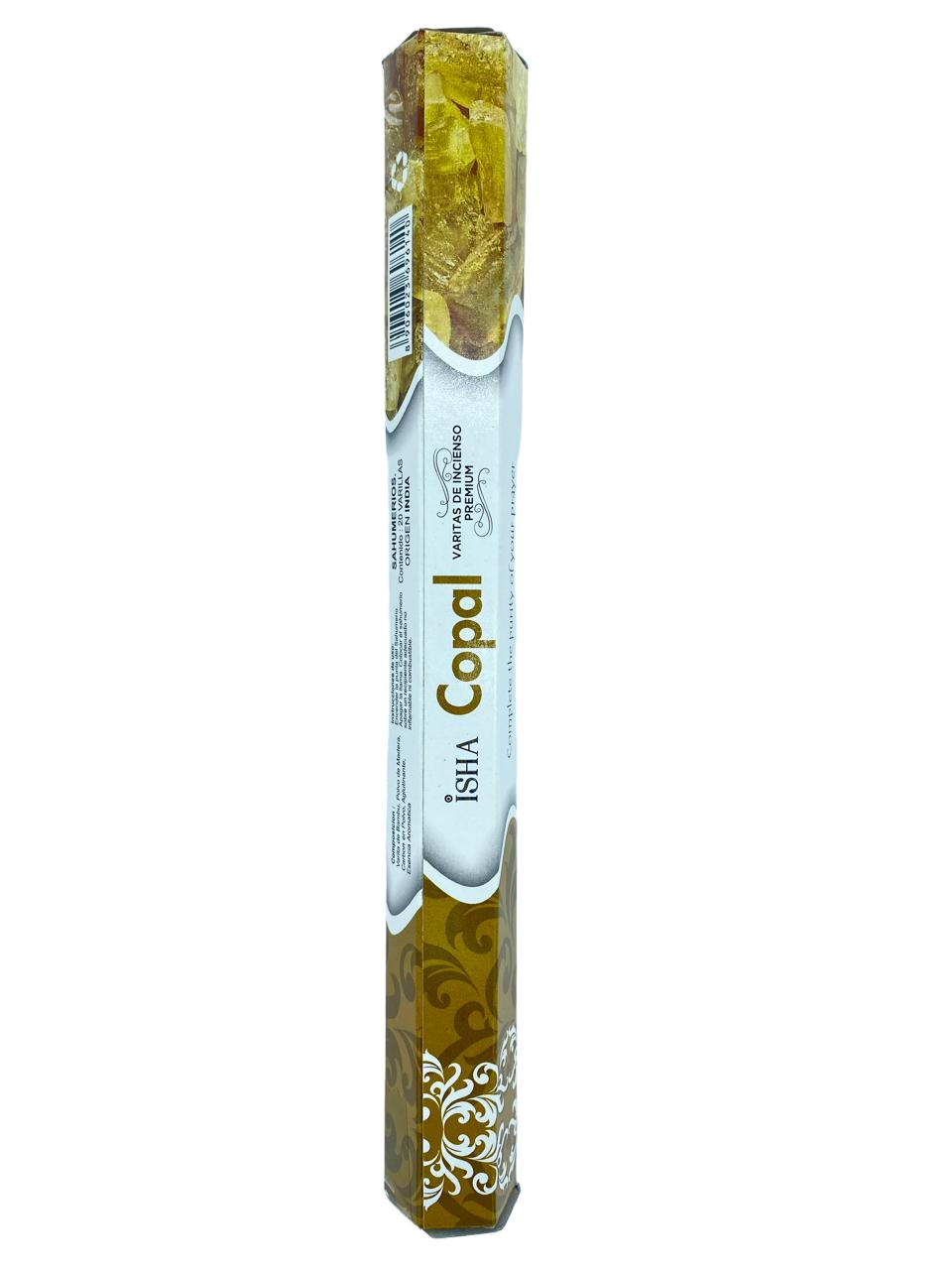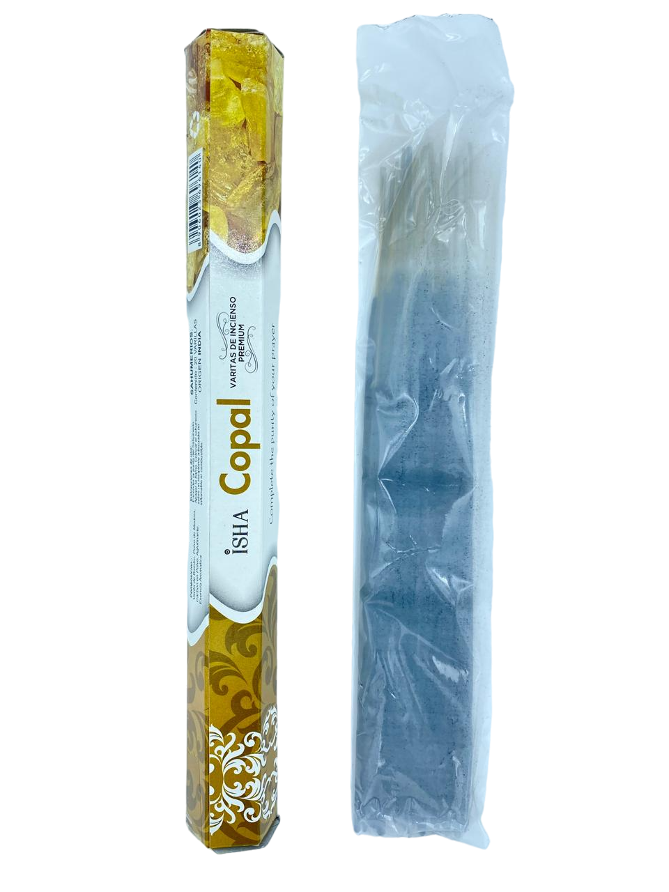 Incienso natural de aroma Copal, sobre que contiene 20 varitas, elaborado en la India.