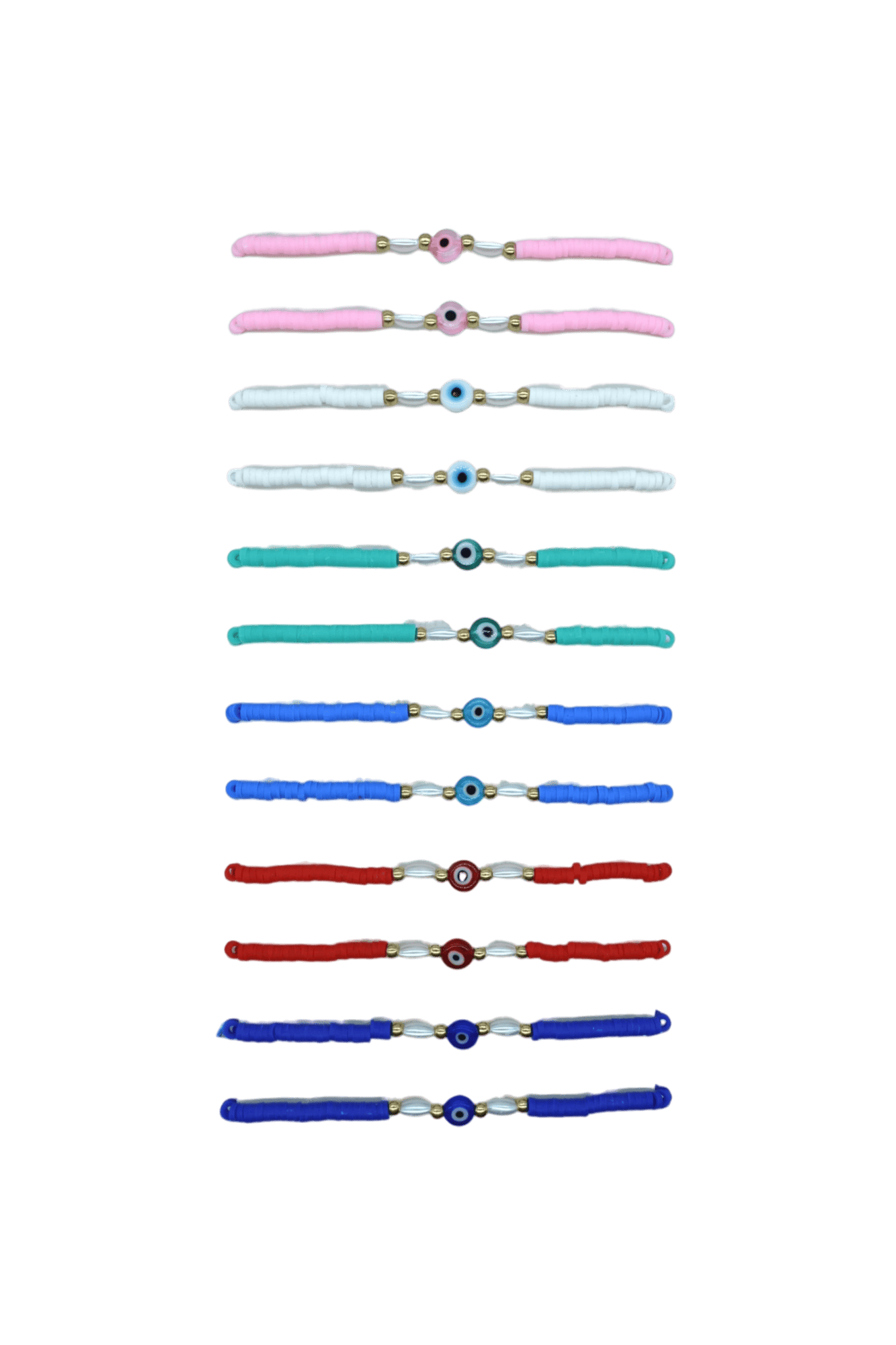 Pulseras de hilo chino con fimo y ojo turco en diferentes colores, El significado popular del ojo turco es que posee propiedades protectoras. Se dice que protege contra el mal de ojo, la envidia y la mala suerte, y que brinda buena suerte y felicidad a su dueño.